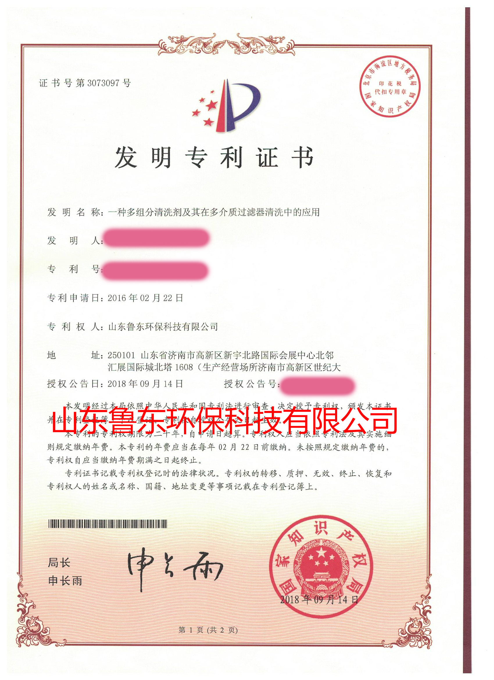 該專利為山東魯東環??萍加邢薰炯夹g研發團隊自主研發的成果,體現了公司在水處理藥劑行業創新能力進一步提高,更體現了公司一直以來對水處理藥劑品質的不斷追求。